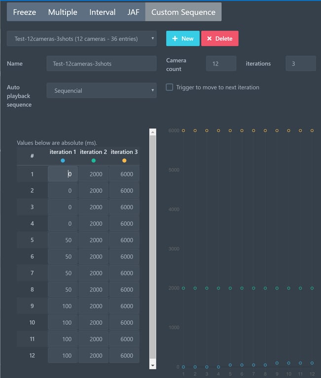 In the example below, I'm using 12 cameras and 3 shots. The first shot is the "A" column, and I want to trigger the cameras 1,2,3,4 at 0ms, then 5,6,7,8 at 50ms and 9,10,11,12 at 100ms. Then at 2000ms and 6000ms, a second and third shots are taken with all cameras.