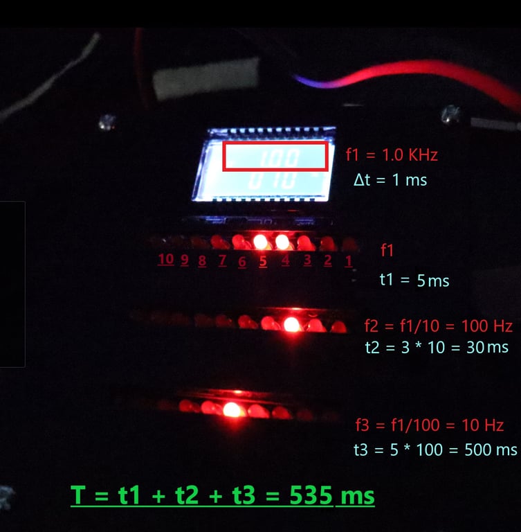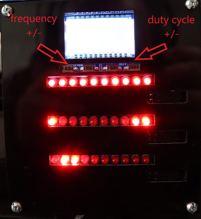 That timer has 3 rows of 10 leds that can increment at any frequency between 1Hz and 10 KHz. The frequency and duty cycle can be set using 4 push buttons below the display.