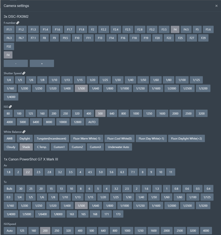 Things get a bit more tricky when trying to match camera settings. If you’re mixing T5 and T6 models, you’ll be able to easily sync settings, but if you’re mixing systems (Sony vs Canon shown below), then most settings need to be set manually across all groups. The settings are going to be in sync across all groups as long as the labels are the same (this works if you mix a R5 and a SL3 but not if you mix a SL3 and a a6400). Use the “link” icon to stop synchronizing across settings that are named the same in different groups.
