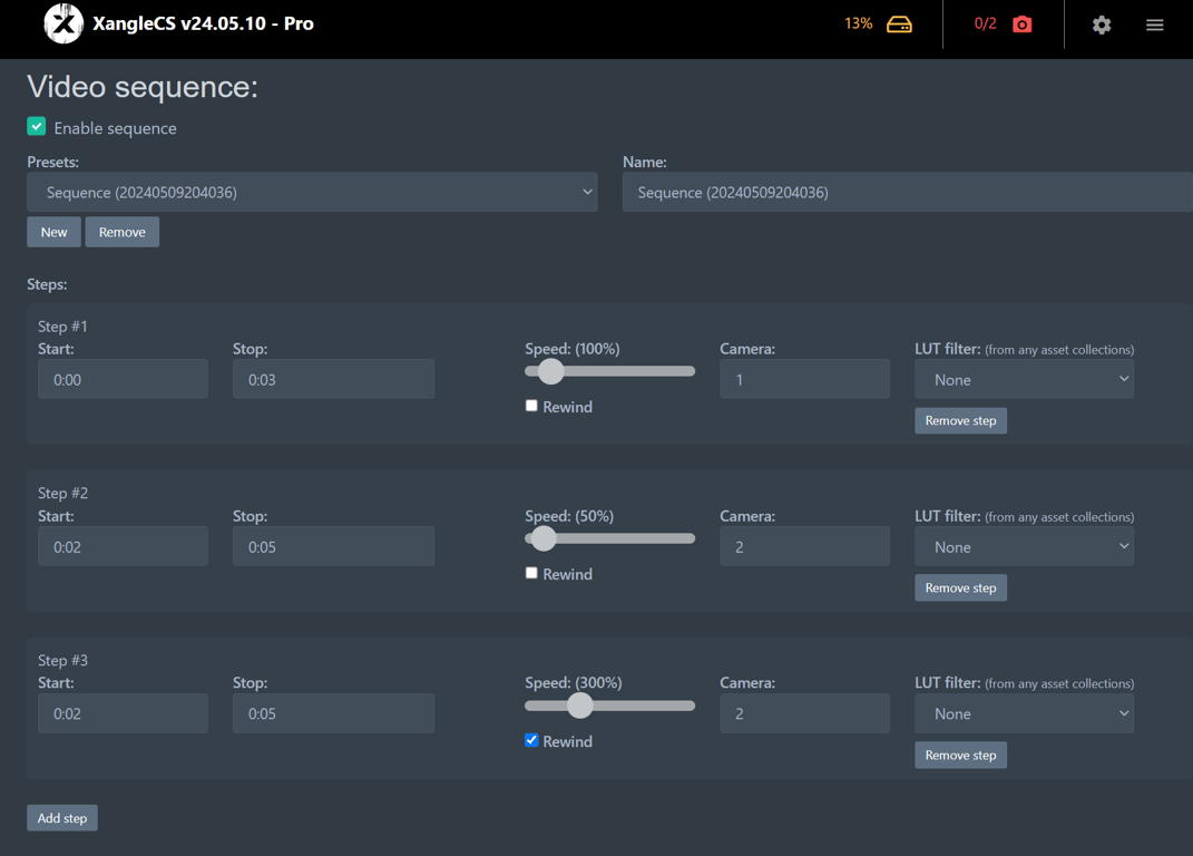 Navigate to http://localhost:8091/video-sequence and add your steps to create your playback recipe. In the example below, I’m taking the first 3 seconds of recording from camera 1 (at normal speed), then I go back and forth on camera 2 for the last 3 seconds (slowed down then sped up)