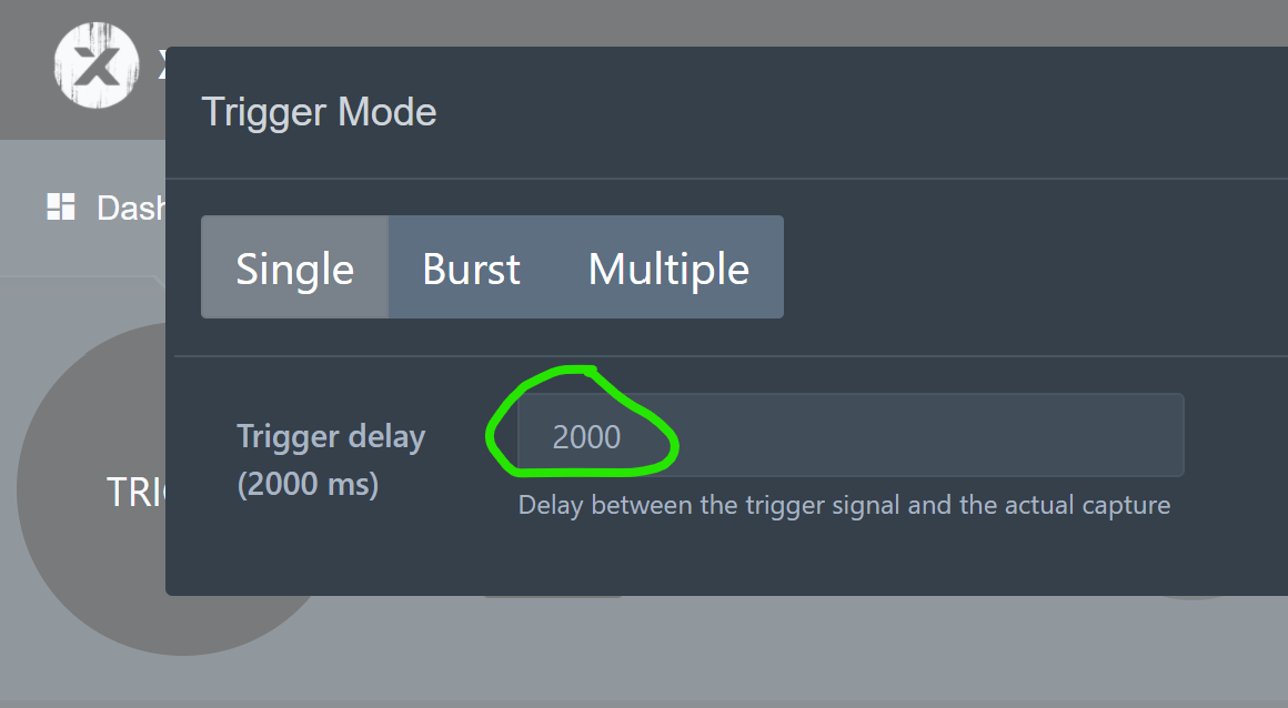 To change the countdown duration, open the dashboard and set the trigger delay in milliseconds (5000ms = 5 seconds)